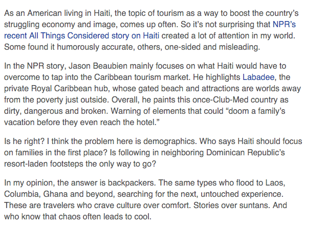 I wrote this article as a response to an NPR piece talking about the challenges of Haiti becoming a tourism destination. As someone who's brought many volunteers down, I give my own perspective on the topic.